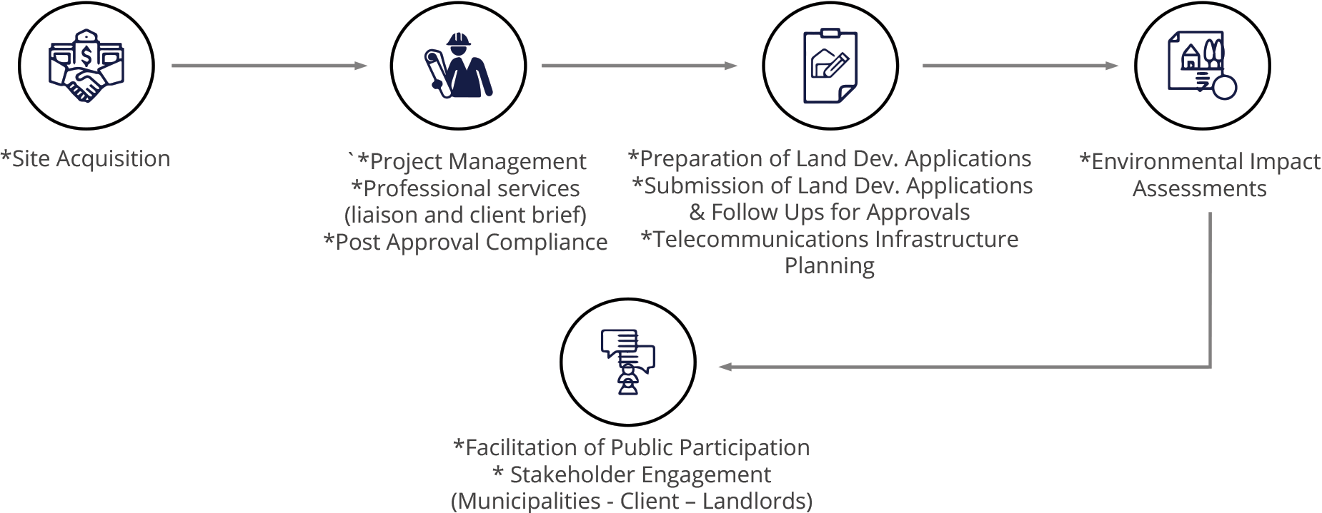Mcebowethu Consultants (Pty) Ltd. provides services in three key sectors; telecommunications, town planning (land use development services) and project management, operating in both public and private entities within the scope of work identified below: